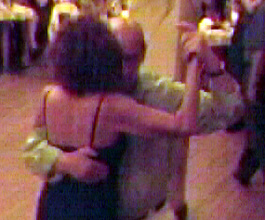 And this arm position can cause problems for the man as well. Try this experiment: stand in front of a mirror and hold your left arm out to the side in about the position El Gallego uses in the third picture. Now tighten all the muscles in your arm. Next, raise your arm and curl your wrist in so your hand is closer to your left ear, and tighten the same muscles. Can you see the difference? When your arm is out to the side and you tighten it, the muscles in your left shoulder and neck should remain relatively unaffected. But when you tighten the muscles with your fist up near your ear, your bicep tightens, your shoulder muscles also begin to tighten, and the muscles on the left side of your neck tighten a little as well. If you look closely, you should see the result: as the muscles contract inside the flexed position of your arm, your left shoulder is pulled up a little, and your head moves slightly to the left. Crowded milongas can sometimes cause a little arm and shoulder tension, so be careful. Using this arm position can pull you off center.